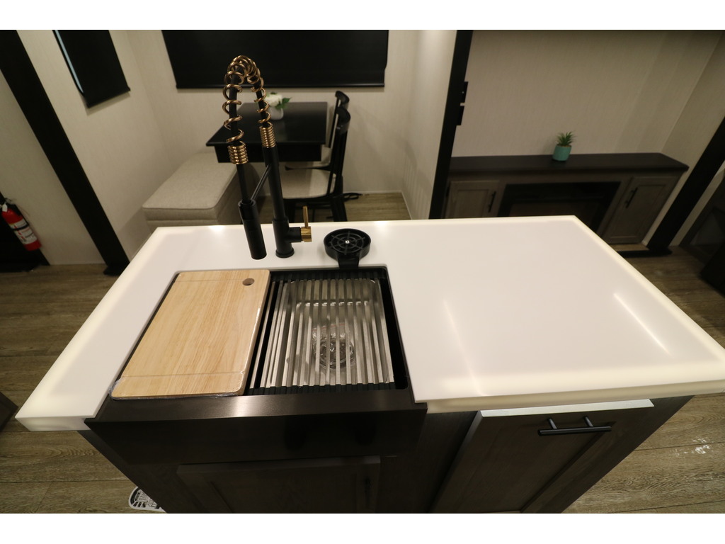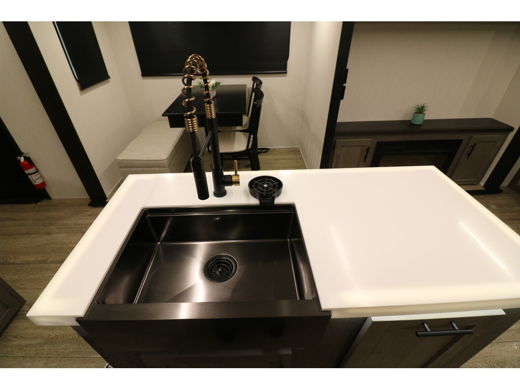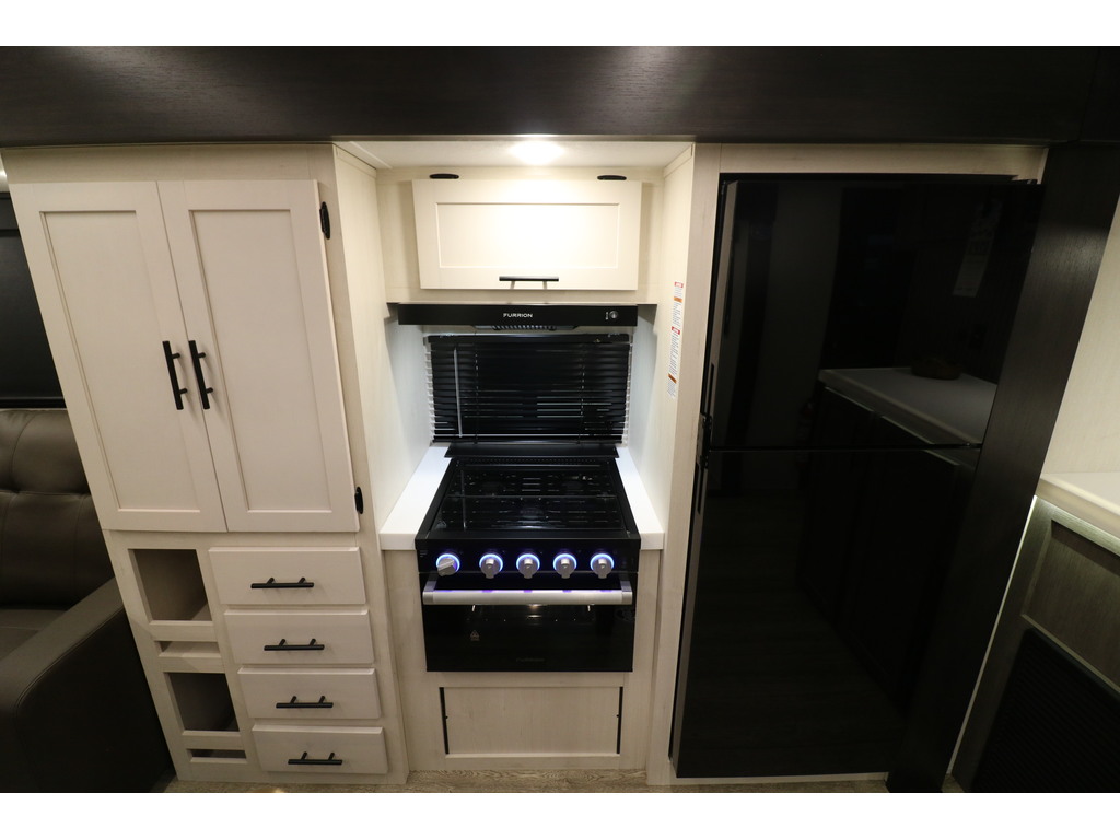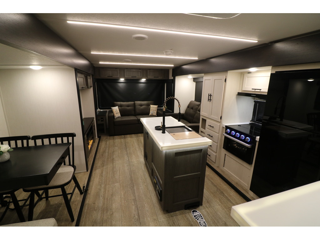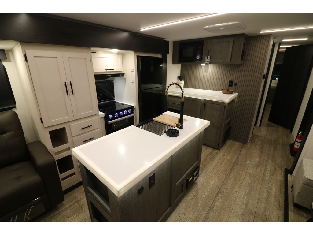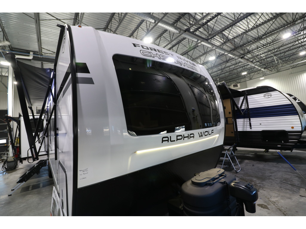 ALPHA WOLF 33RL 2025 Roulotte pour couple avec un poids de 8800 livres. INTÉRIEUR: - Cuisine avec îlot central, grand évier, cuisinière avec dessus vitré, micro-ondes et grand réfrigérateur - Grand garde-manger - Table avec 2 chaises et un banc qui peut également servir de rangement - Tiroir intégré dans la table pour ranger votre coutellerie - Causeuse avec sièges inclinables - Sofa-lit arrière en cuir avec une belle fenestration tout autour - Foyer électrique avec espace au-dessus pour un téléviseur avec rangement tout autour - Chambre avant avec très grand lit, espace lecture devant la fenêtre, petit foyer électrique , beaucoup de rangement et possibilité d'avoir laveuse/sécheuse dans l'armoire à côté du lit - Salle de bain avec douche en verre et belle vanité - Système d'aspiration roadvac pour faciliter la nettoyage EXTÉRIEUR: - Marches ultra robustes - Coffres de rangement - Cuisine extérieure avec réfrigérateur, machine à glace et même un téléviseur - Jack électrique - Douchette extérieure - Auvent électrique avec lumières Photos à titre indicatif