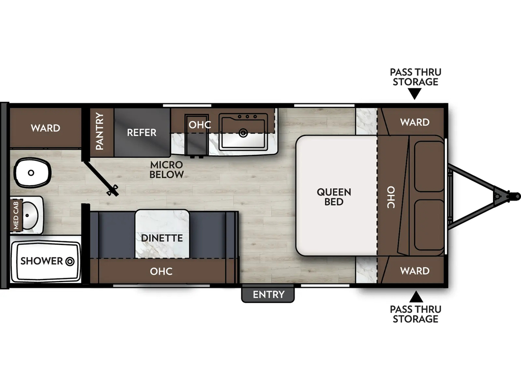 Options : Convertisseur de courant continu, Réservoir de propane, Climatiseur au plafond, Ventilateur au plafond, Vérin stabilisateur, Roue de secours, Douche extérieure, Douche, Toilette, Lit queen-size, Prise électrique, Détecteur LPG/CO2, Prise cable, Micro-onde, Auvent, Chauffe-eau à allumage direct