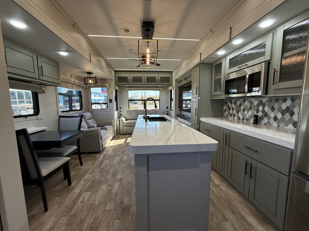 Options : Jantes aluminium, Convertisseur de courant continu, Réservoir de propane, Climatiseur au plafond, Climatiseur conduit central, Ventilateur au plafond, Douche extérieure, Attache-remorque, Toilette, Prise électrique, Détecteur LPG/CO2, Téléviseur, Antenne pour téléviseur, Micro-onde, Cuisinière, Four, Hotte, Auvent, Chauffe-eau