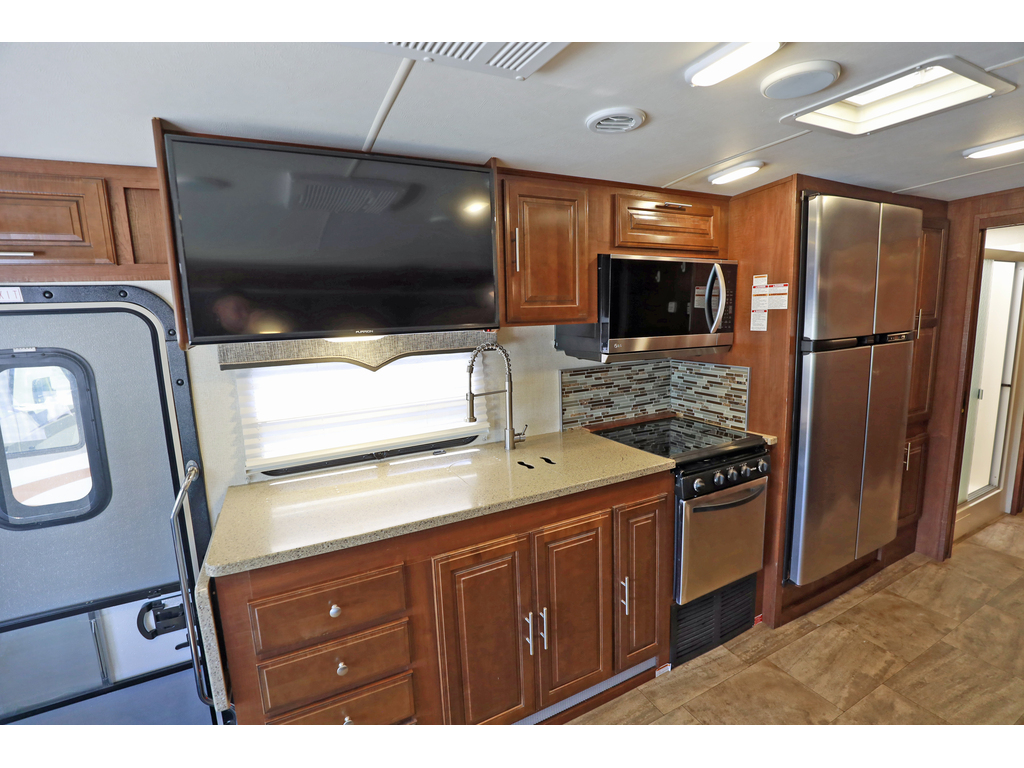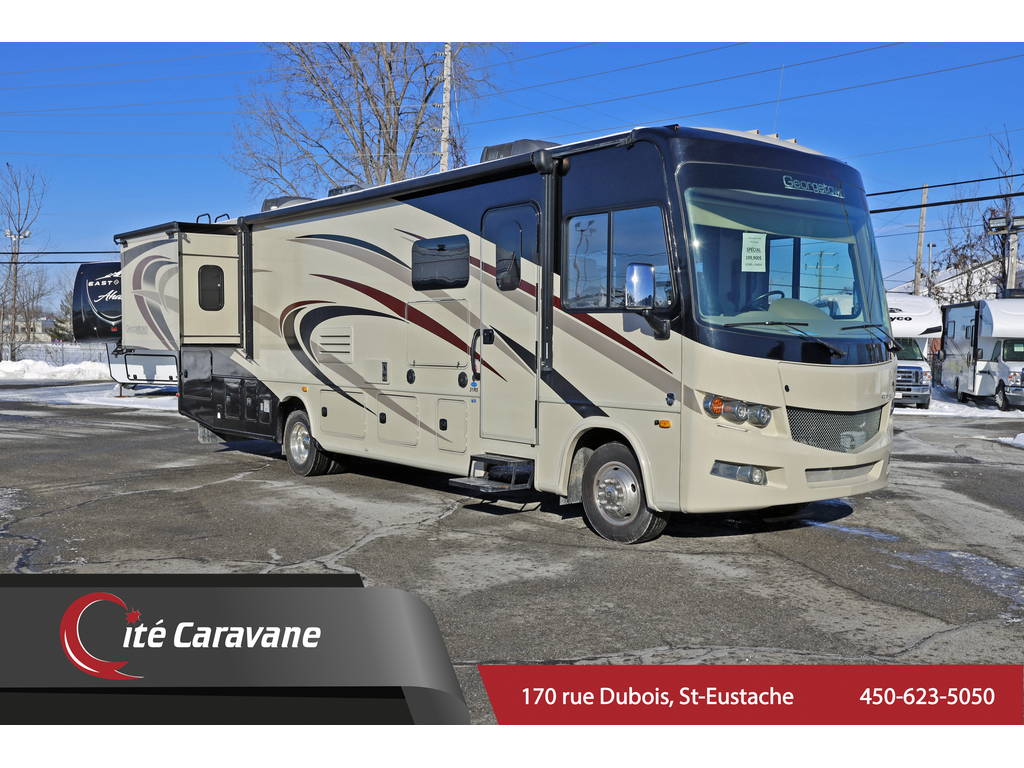 Forest River Georgetown GT5 31R5 Classe A. Son équipement complet débute par des caméras latérales et arrière, fenêtres thermos (artic pack 4 saisons), toit une pièce en fibre de verre, murs extérieurs avec finition Gel Coat et fabrication de type Vacuum Bonded, portes de coffres avec pentures latérales, black tank flush (système de nettoyage de la fosse deaux noires), éclairage dans les coffres extérieurs, , alimentation électrique 50 ampères, auvent principale électrique, auvents protecteurs au-dessus des extensions, stabilisateurs hydrauliques automatiques, génératrice 5500 WATTS, inverter 2000 WATTS INTÉRIEUR : Revêtement de plancher de qualité supérieure (Beauflor), chauffe-eau 6 gal, antenne automatique, fantastic fan, lit king pour la chambre principale, lit au-dessus des sièges conducteur et passager, lecteur AM/FM/DVD/Bluetooth & USB intégré, réfrigérateur 18 pi3 propane et électrique, chauffage de 35 000 BTU etc. Contactez-nous au (450) 623-5050 pour profiter du MEILLEUR CHOIX AU QUÉBEC, www.citecaravane.com Une compagnie à votre service depuis 1973 Forest River Georgetown GT5 31R5 Class A. Its complete equipment starts with side and rear cameras, dual pane windows (artic pack 4 seasons), one-piece fiberglass roof, exterior walls with Gel Coat finish and Vacuum Bonded type construction, gates chests with side hinges, black tank flush, lighting in the outer chests, 50 amp power supply, electric awning, awnings over extensions, automatic hydraulic stabilizers, generator 5500 WATTS, inverter 2000 WATTS INTERIOR: Superior quality flooring (Beauflor), 6 gal water heater, automatic antenna , fantastic fan, king bed for master bedroom, bed over driver and passenger seats, built-in AM / FM / DVD / Bluetooth & USB player, 18 cu. ft. propane and electric refrigerator, 35,000 BTU heating, etc. Contact us at (450) 623-5050 to take advantage of the biggest RV choice in québec www.citecaravane.com A company at your service since 1973